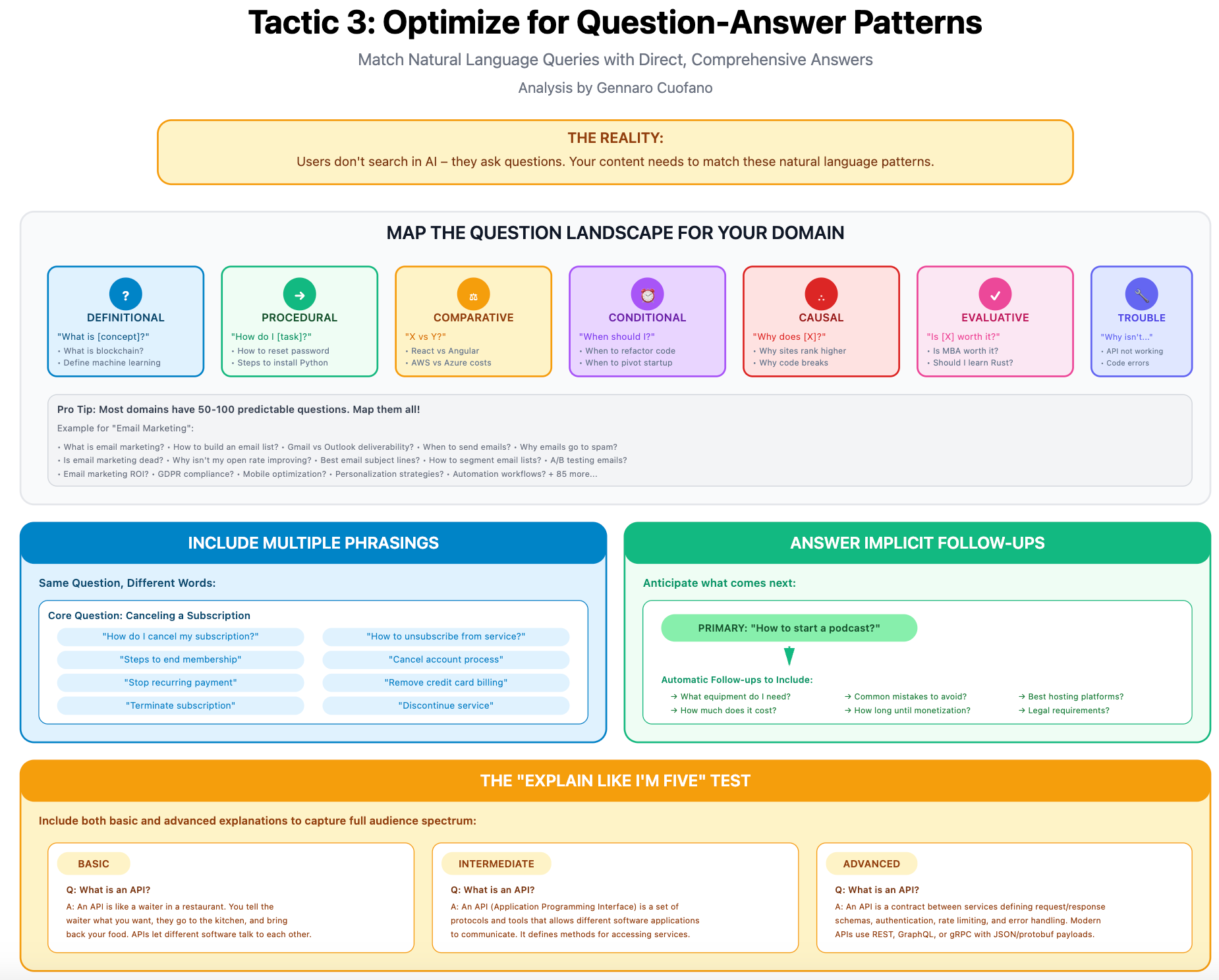 Map the question landscape for your domain. Every topic has predictable question patterns: