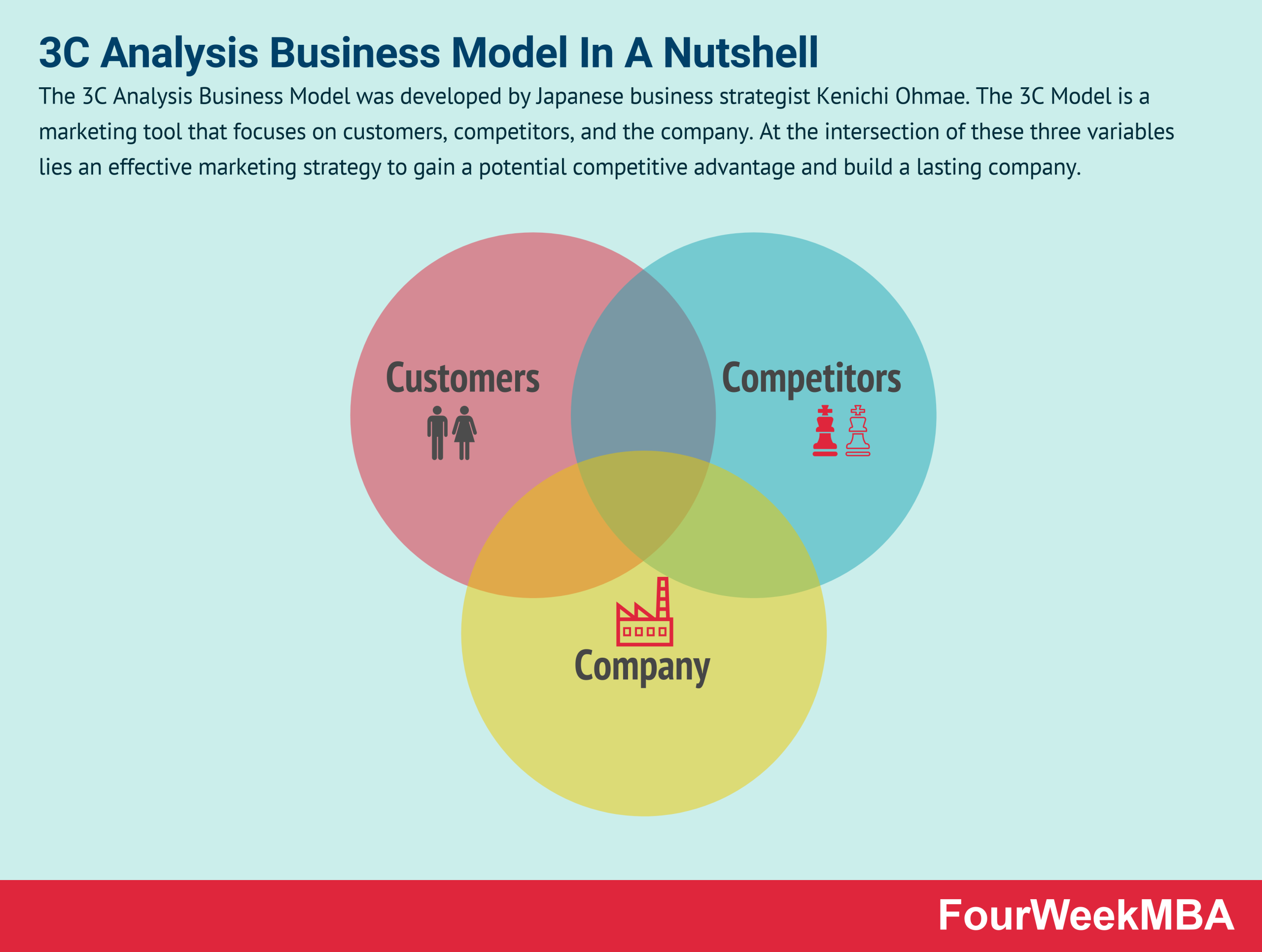 Another way to look at business models is through the 3c model analysis, where the three components that make up the business model are customers, competitors, and company. The 3C Analysis Business Model was developed by Japanese business strategist Kenichi Ohmae.