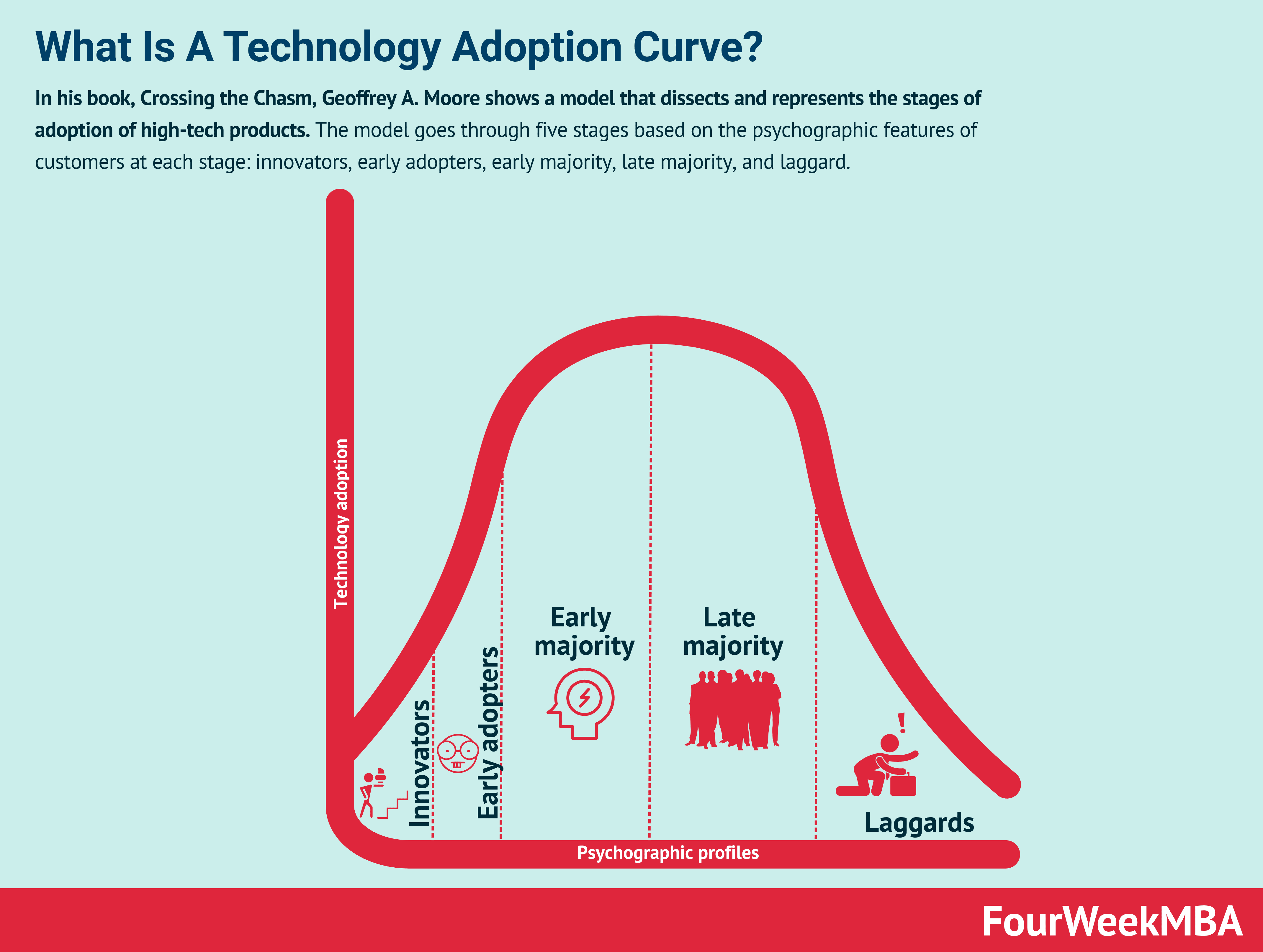 If you are familiar with the technology adoption curve model, you might know how technologies move from innovators down to late majority and laggards. It’s important to remark that the process of technology adoption it’s all but linear. Indeed, there are many “chasms” that technologies have to go through before getting to the point of mass adoptions and those are not guaranteed at all.