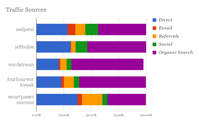 This is the name of a person, but also the name of a website and a brand. Neil Patel has been implementing several strategies to grow his brand. No surprise that direct traffic is one of the primary sources for his site: