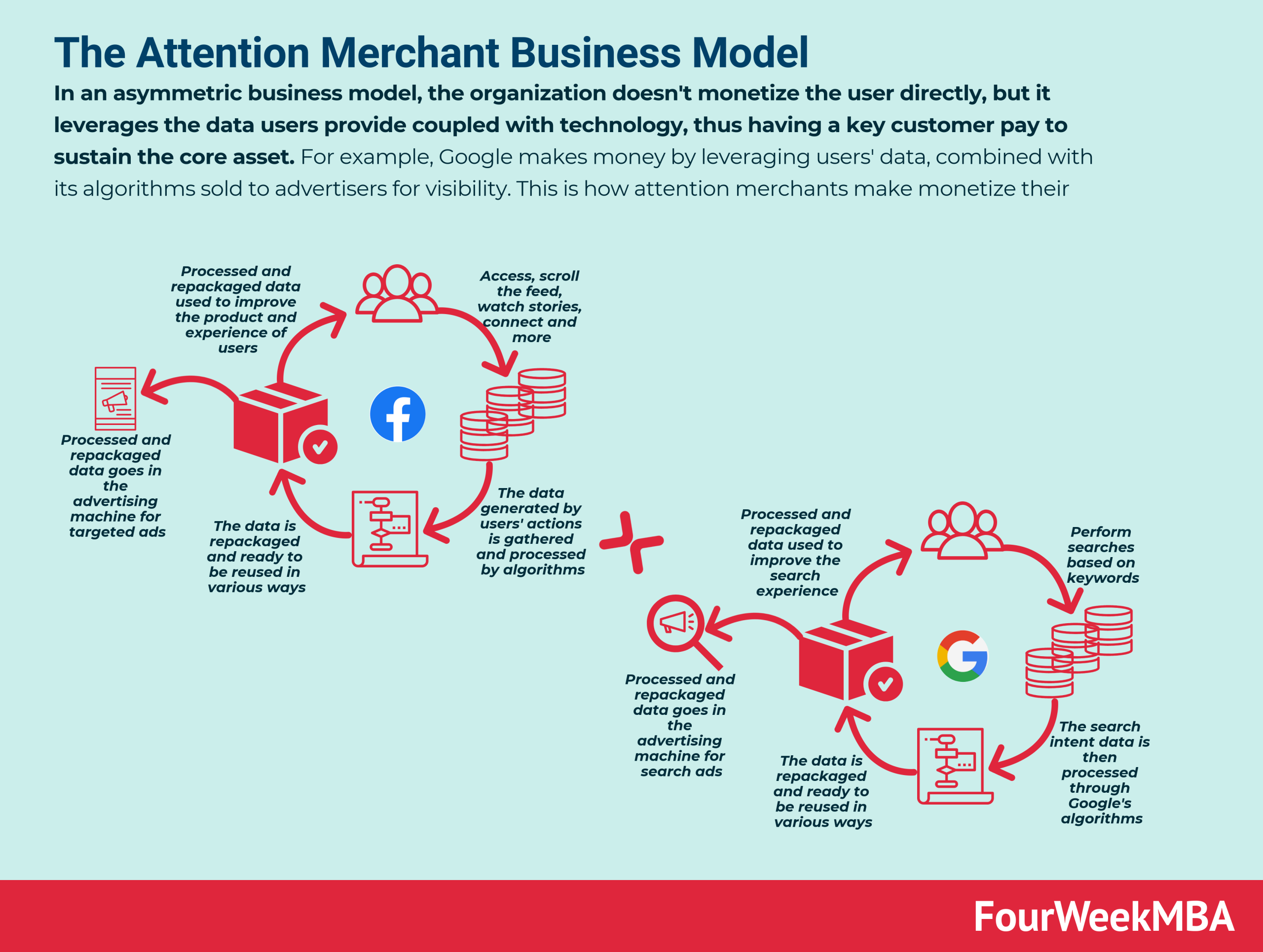 - Both are asymmetric business models. As I explain here, asymmetric business models, work by offering a free, incredible tool/service/application, to users, at scale. While this is apparently free, the same free users represent the main asset for the company. Therefore, both Facebook and Google, 1. monetize their users’ traffic via advertising 2. are able to profit from users’ data, way more than the value of the data for a single user (thanks to network effects). Thus, the data is much more valuable to Google/Facebook in their advertising marketplace, than to a single user 3. the way Google/Facebook can leverage the data is asymmetric, as they get two companies that combined are worth trillions, and the free user on the other side gets either easy to find information (Google) or entertainment/connection (Facebook). Worth highlighting also how benefits for society are created when more and more users freely use these applications at scale. However, also negative externalities arise (which are not accounted for in these companies’ balance sheets), which are carried by the collective.