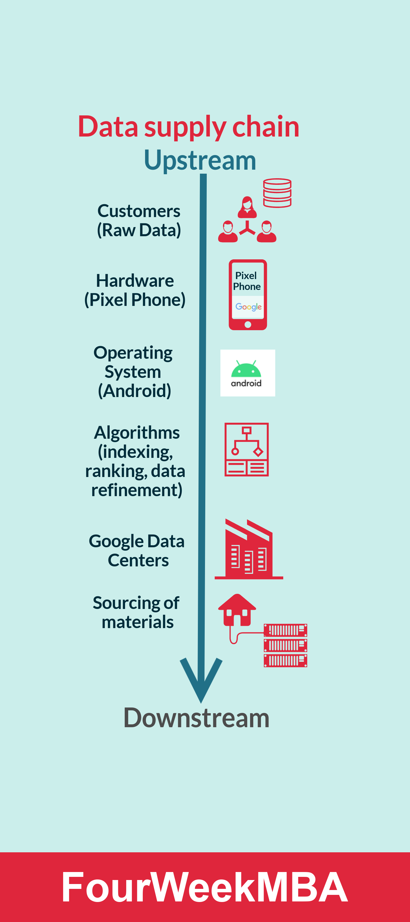 - While other tech giants like Google and Apple are vertically integrated and control the whole supply chain of data. In fact, Apple runs iOS operating system on the iPhone and the Apple Store. While Google runs the Android operating system on Android Devices, and the Google Play marketplace on top of these devices. These are the mobile distribution pipelines that enable apps, like Facebook & Instagram to be experienced by billions of users.