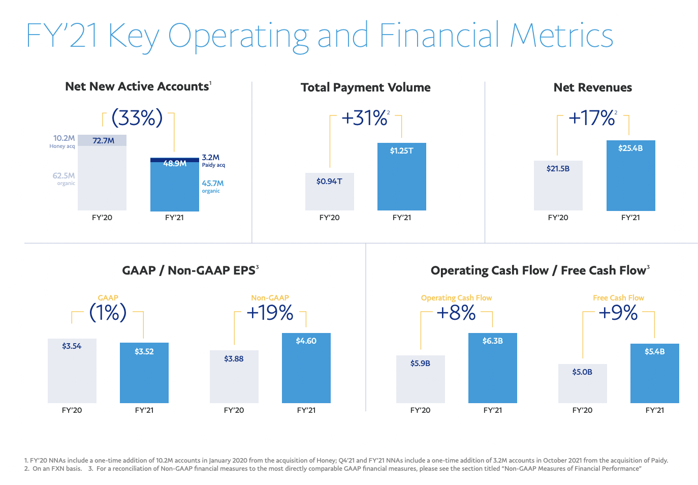 This is the definition of active customer account given by PayPal. As of 2021 PayPal added 48.9 million new accounts.