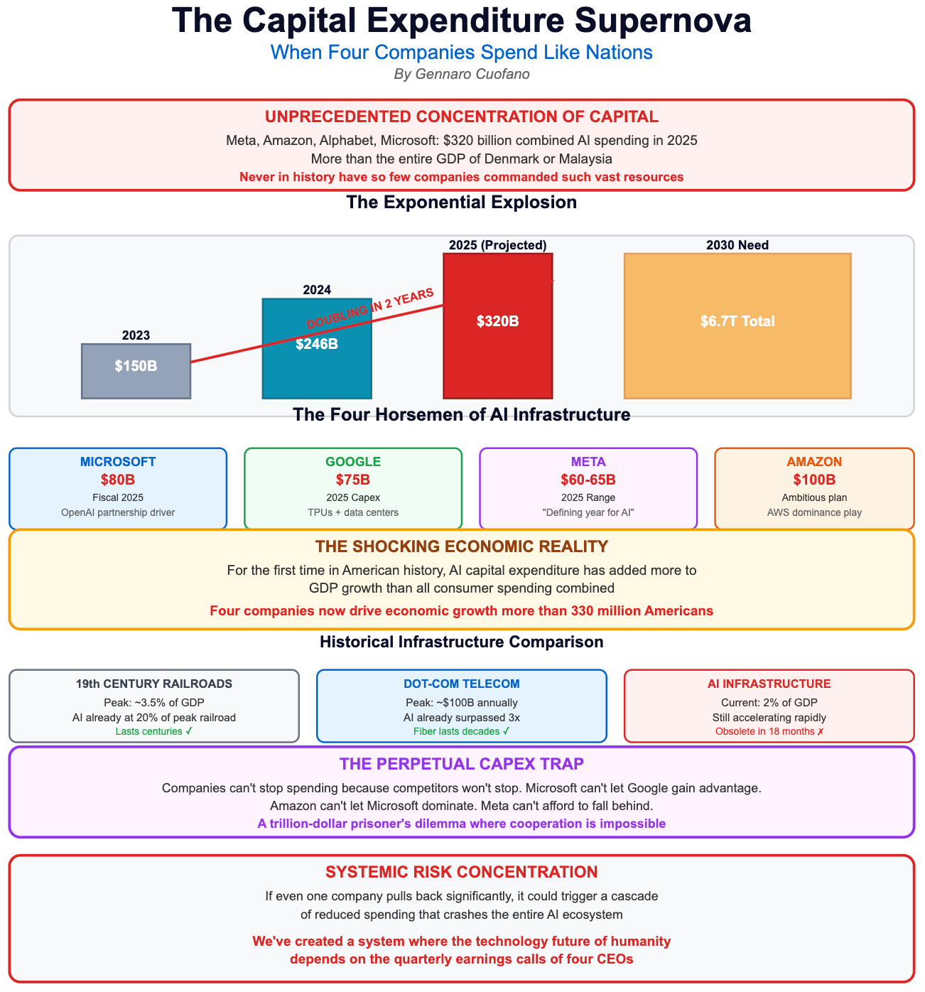 Meta, Amazon, Alphabet, and Microsoft plan to spend over $300 billion combined on AI infrastructure in 2025 alone. To put this in perspective, that’s more than the entire GDP of countries like Denmark or Malaysia, concentrated in the hands of four corporations betting on artificial intelligence.