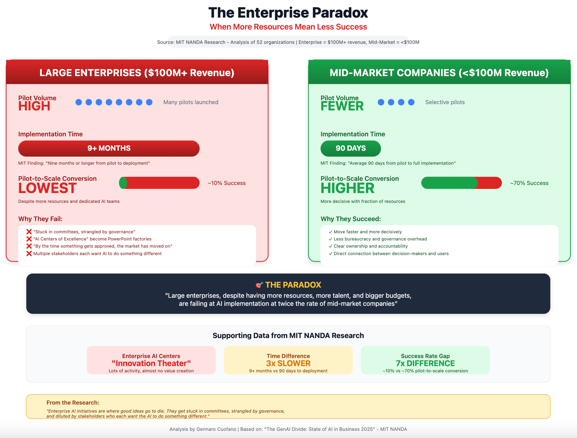 Large enterprises lead in pilot volume but have the lowest pilot-to-scale conversion rates. They’re essentially running innovation theater—lots of activity, lots of PowerPoints, lots of “AI Centers of Excellence,” but almost no actual value creation. Meanwhile, mid-market companies with a fraction of the resources are quietly revolutionizing their operations.