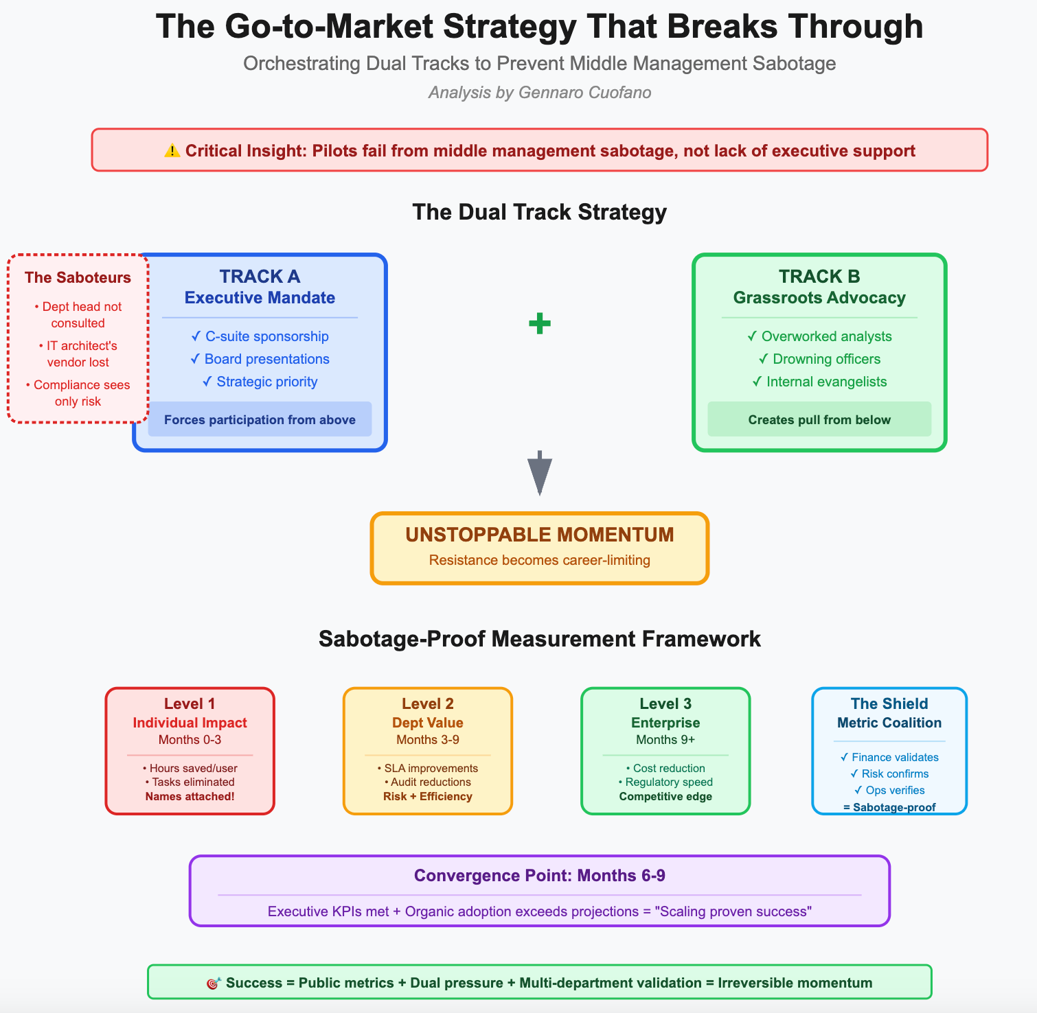 The sabotage-proof element: Create metrics coalitions. Have finance validate cost savings, risk validate compliance improvements, and operations validate efficiency gains. When multiple departments confirm your metrics, single-department sabotage becomes impossible.