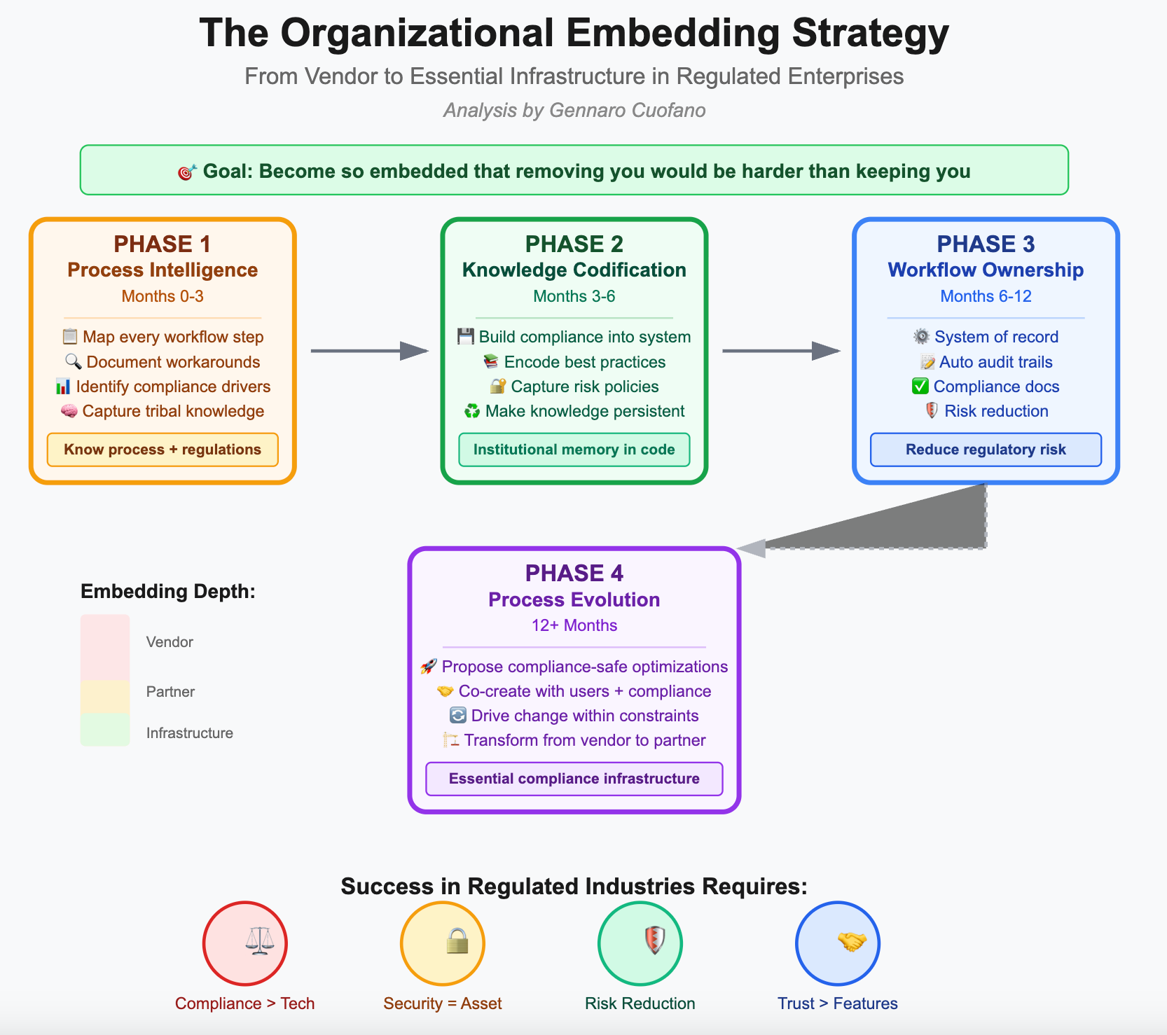 - Months 9-12: Organizational Transformation Push for process improvements within regulatory constraints. Expand use cases based on proven compliance capabilities. Become embedded in their compliance and operational infrastructure. Plan multi-year partnership, not just vendor relationship.