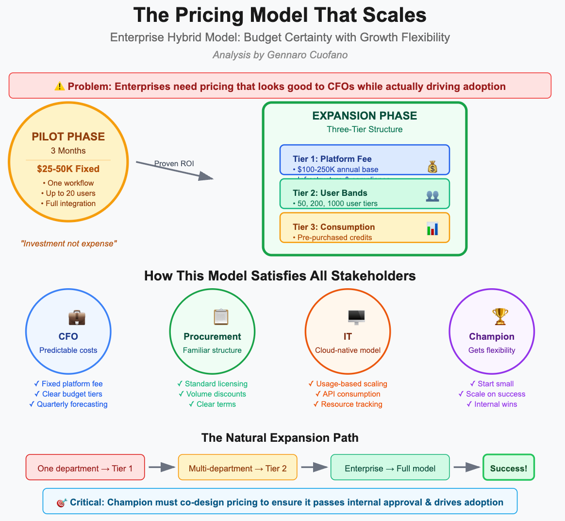 Enterprises need pricing that looks good to CFOs while actually driving adoption. The solution is a hybrid model that provides budget certainty with growth flexibility.