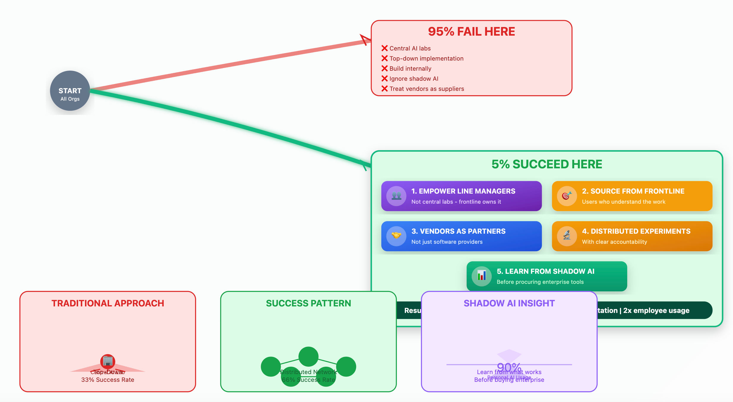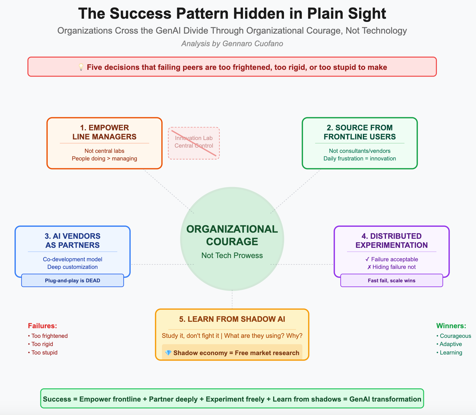 Organizations that successfully cross the GenAI divide don’t do so through technology prowess—they do it through organizational courage. They make decisions that their failing peers are too frightened, too rigid, or too stupid to make: