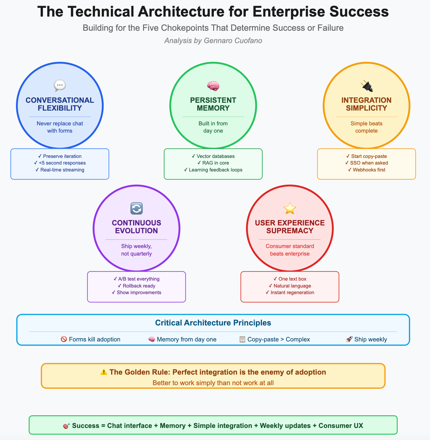 User experience supremacy beats enterprise features every time. One text box, not twelve form fields. Natural language, not dropdowns. Instant regeneration, not IT tickets. Visible processing, not black boxes. The consumer experience is the standard users expect, and enterprise features that degrade that experience will kill adoption.